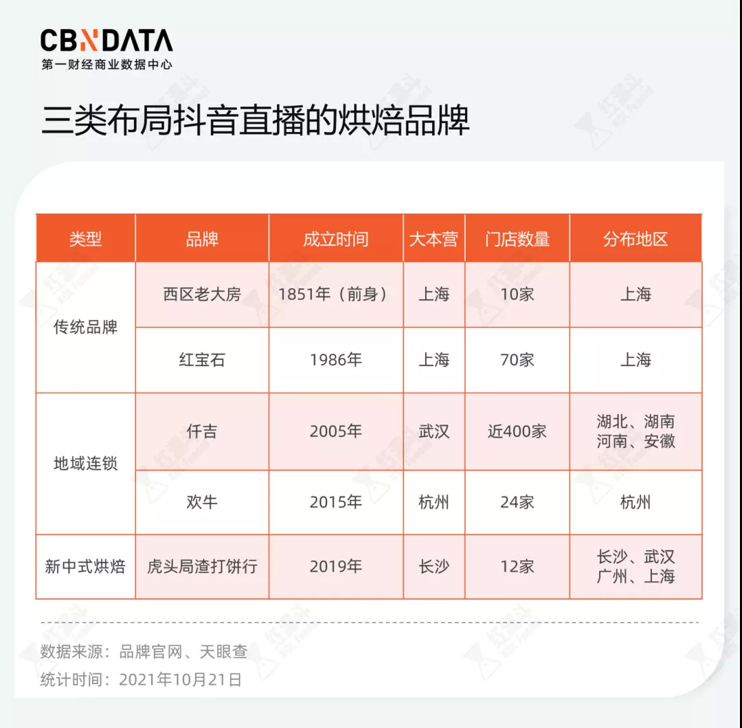 今年下半年,多家本地连锁烘焙糕点品牌开启抖音直播。具体来说分为三类,第一类是以虎头局渣打饼行(以下简称“虎头局”)为代表的的新中式烘焙网红,第二类是以上海红宝石、西区老大房为代表的传统老字号品牌,第三类是在新一线城市杭州、武汉起家的区域性头部连锁品牌。