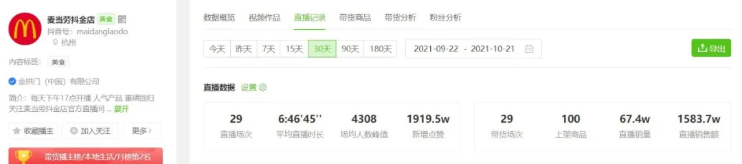 三大连锁快餐品牌均进入飞瓜抖音本地生活9月数据榜单TOP 10。排名第二的麦当劳在国内拥有超过4600家门店,官方直播账号“麦当劳抖金店”于7月底首播,2个多月累积超过100万粉丝,场均直播销售额达到30-40万,近30天累计销售额超过1500万。