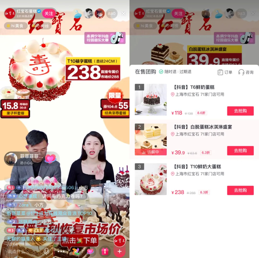 传统品牌们同样希望赶上当今时代的潮流。C站发现,红宝石、西区老大房两家上海本地品牌都在近期加入抖音直播,前者售卖到店兑换的团购优惠券、后者主要售卖冷链运输的半成品。
