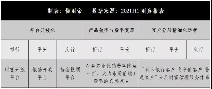 根据公开信息与2021H1财务报表,懂财帝将银行机构的主流打法分为三类:平台开放化、产品效率与费率变革、客户分层精细化运营。