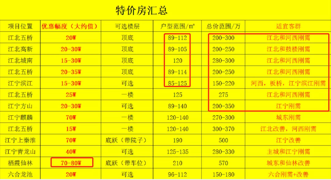 从表中可以看出主力区域还是在江北和江宁,小户型刚需为主,优惠力度主要在20万-30万之间,当然也有少部分大面积高总价的改善盘,优惠幅度在40万-80万之间。
