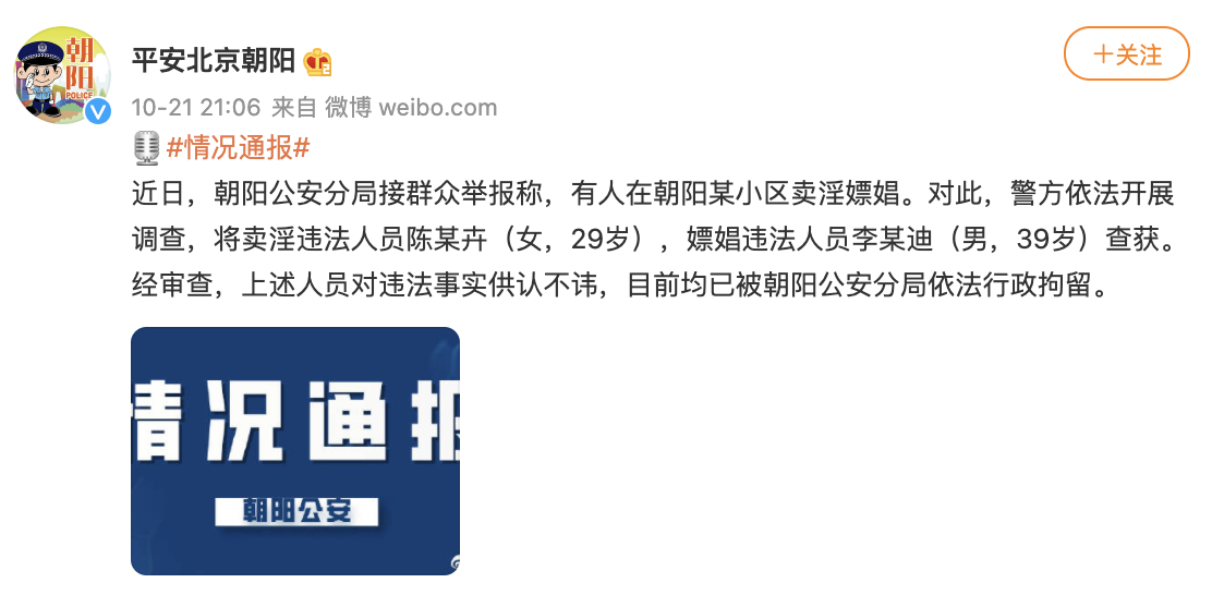 据@平安北京朝阳 微博消息,近日,朝阳公安分局接群众举报称,有人在朝阳某小区卖淫嫖娼。对此,警方依法开展调查,将卖淫违法人员陈某卉(女,29岁),嫖娼违法人员李某迪(男,39岁)查获。经审查,上述人员对违法事实供认不讳,目前均已被朝阳公安分局依法行政拘留。