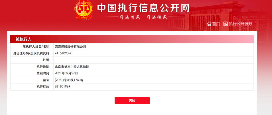 近日,中国执行信息公开网新增一条被执行人信息,荣盛控股股份有限公司(下称荣盛控股)被北京市第三中级人民法院列为被执行人,执行标的为681,801,980元,案号为(2021)京03执1750号。