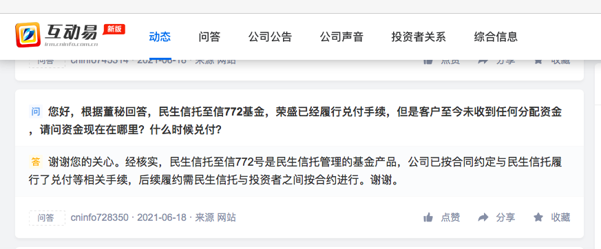 界面新闻发现,2021年6月,就有一名投资者在深交所互动易平台提问荣盛发展的董秘。该投资者问道,“董秘您好!民生信托至信772号,荣盛已经履行兑付手续,但是客户至今未收到任何分配资金,请问资金现在在哪里?什么时候兑付?”