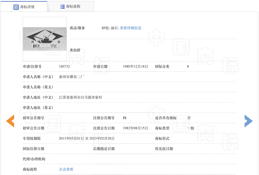 中国商标网相关信息显示:国内第一个注册“坦克”商标的是泰州市磨具二厂,注册时间是1980年12月,专用权期限到2023年2月28日。而“坦克TANK”这一商标也早在1998年1月被个人注册,目前该商标处于续展阶段。