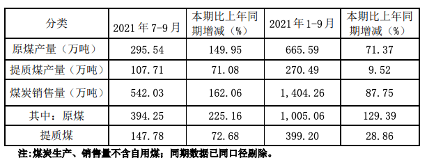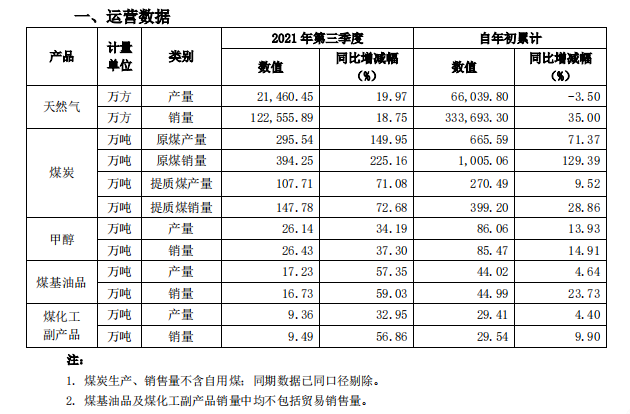 第三季度,公司的天然气、煤炭、甲醇、煤基油品、煤化工副产品产量、销量均出现较为明显的增长。其中煤炭增幅最为明显,产量增长149.95%,销量增长225.16%。