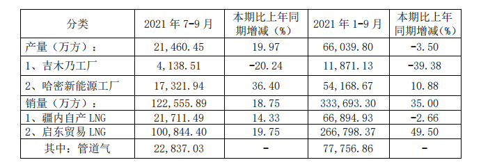 从产量来看,广汇能源7月到9月产气21460.45万方,比上年同期增加19.97%,其中,哈密新能源工厂实现LNG产量17321.94万方,同比增长36.4%;1月到9月,公司总产量66039.80万方,比上年同期减少3.5%。其中,哈密新能源工厂实现LNG产量54168.67万方,同比增长10.88%。