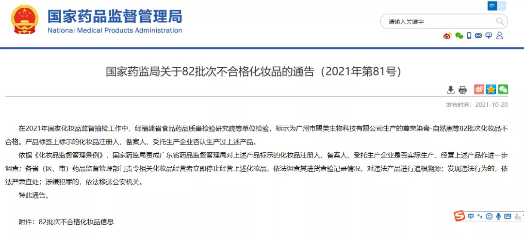 通告显示,在2021年国家化妆品监督抽检工作中,经福建省食品药品质量检验研究院等单位检验,标示为广州市赐美生物科技有限公司生产的尊荣染膏-自然黑等82批次化妆品不合格。产品标签上标示的化妆品注册人、备案人、受托生产企业否认生产过上述产品。
