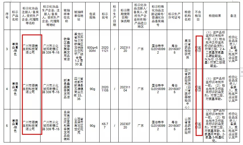 值得注意的是,此次,广州市景红达精细化工有限公司生产的6批次景红达染发膏因“标签标识”不合格“榜上有名”,包括广州市赐美生物科技有限公司在内,这两家公司已经不是第一次“上榜”。早在2020年12月中旬,他们已被国家药监局点名。