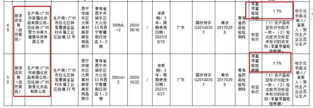 广州市梵高精细化工有限公司生产的月月爱染发水、以及凡高染发膏等3批次被检出“苯基甲基吡唑啉酮”不合格,检验结果都高于0.5%。广州市白云玉洁化妆品厂生产的英歌染发膏,广州市彩运来化妆品有限公司生产的盛彩源染发膏(SCY 200419)的“苯基甲基吡唑啉酮”使用量分别为0.93%、0.85%。广州市新霸化妆品有限公司生产的5批次新派染发膏中,有4批次被检出“苯基甲基吡唑啉酮”不合格,2批次检验结果为1.1%。