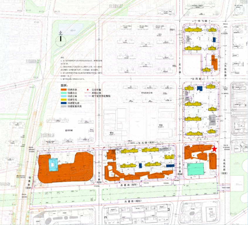 该项目位于南京市玄武区铁北红山新城中心区域,东至北苑东路,南至丹霞路(含丹霞路地下空间)、西至恒嘉路、北至文五路、华飞路,总用地面积 214518.99 平方米。