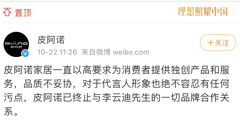 可以想见,在当前对劣迹艺人趋严的舆论环境下,李云迪现有的商业合作未来将悉数取消。22日中午,皮阿诺官方微博发布消息称,“皮阿诺家居一直以高要求为消费者提供独创产品和服务,品质不妥协,对于代言人形象也绝不容忍有任何污点,皮阿诺已终止与李云迪先生的一切品牌合作关系。 ”在今年年初,皮阿诺才签约李云迪,聘任其为公司代言人。