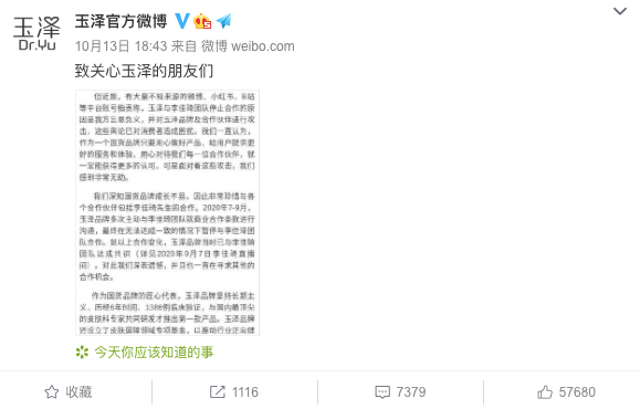 这些导火索让玉泽发了一则声明,大概内容解释了解绑是双方团队协商后达成的共识,也强调了自己是国货品牌代表,恳请网友停止“以讹传讹”。