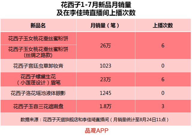 同样是李佳琦带火的国货品牌花西子,也尝到了主播带来的流量红利,一度让业界认为花西子沦为为李佳琦“打工”。品观app去年的一组数据可以看到,李佳琦上播次数对产品销量的对比十分显著。