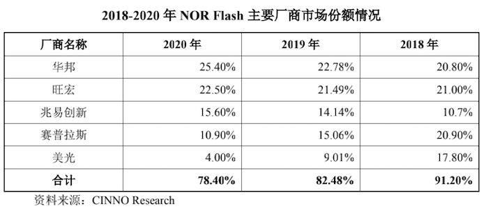 CINNO Research数据显示,目前,全球NOR Flash市场主要由华邦、旺宏、兆易创新和赛普拉斯四家厂商主导,合计约占据四分之三的市场份额。今年8月刚登陆科创板的同行普冉股份2020年市场份额为2.9%。恒烁股份作为市场新进入者,市场份额只有1.5%,外部竞争压力不小。