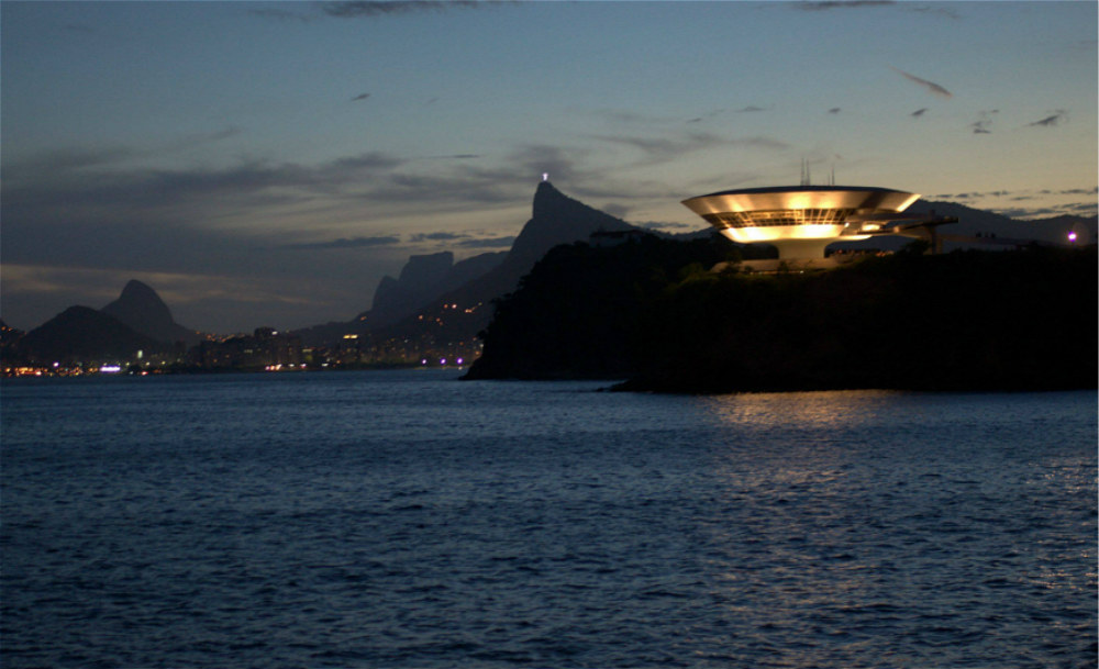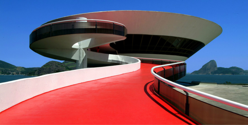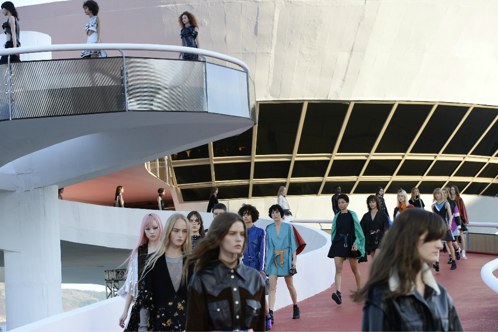 作为未来主义的死忠粉,创意总监Nicolas Ghesquière将秀场选在地标性建筑尼泰罗伊当代艺术博物馆 (Niterói Contemporary Art Museum)。这座如同飞碟一般“漂浮”于大西洋畔的建筑是巴西设计大师奥斯卡•内梅耶的作品,于20年前落成。一条宽宽的坡道蜿蜒而上通向博物馆展厅,巧合的是,它就如同田径赛场的跑道一样被漆成红色。