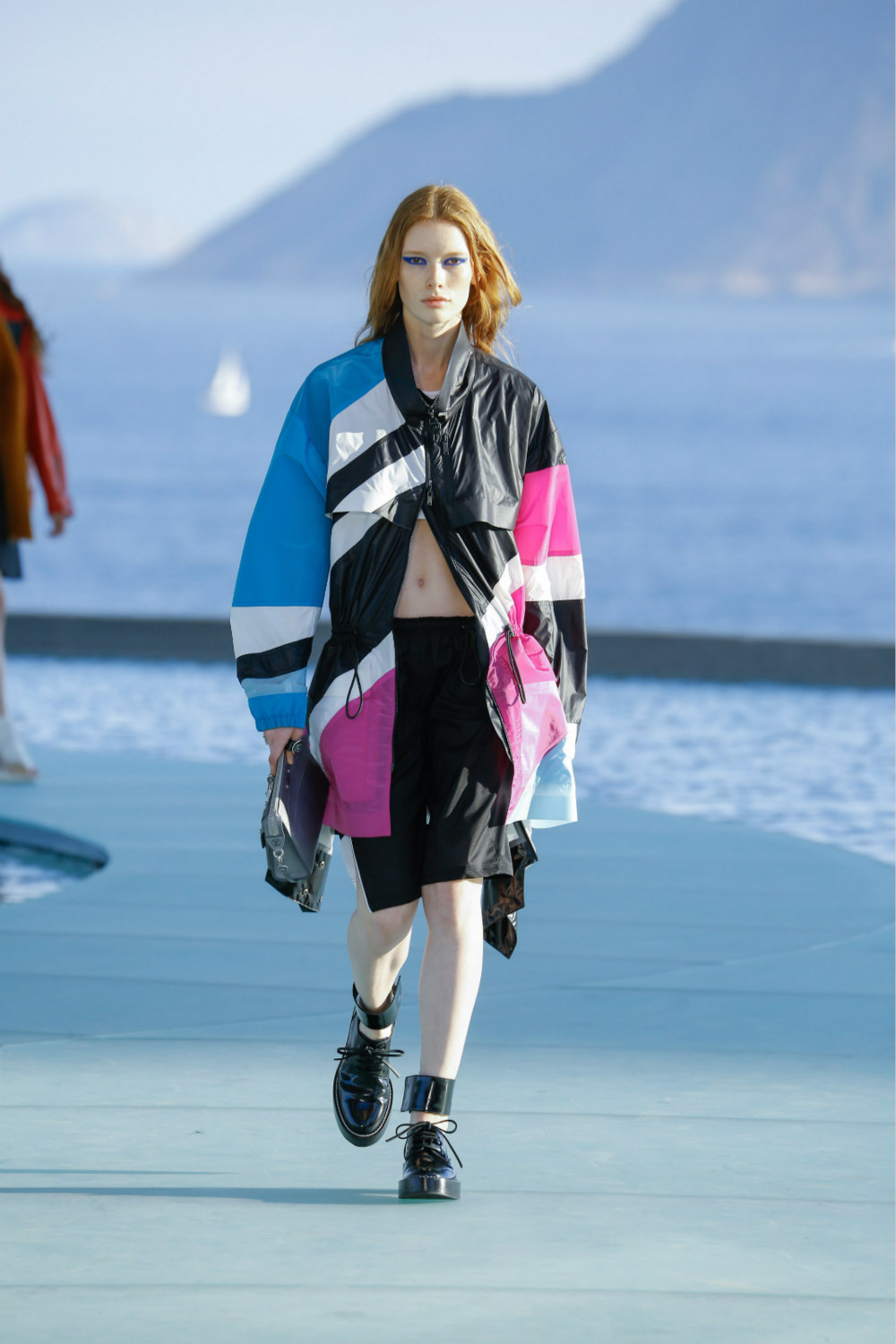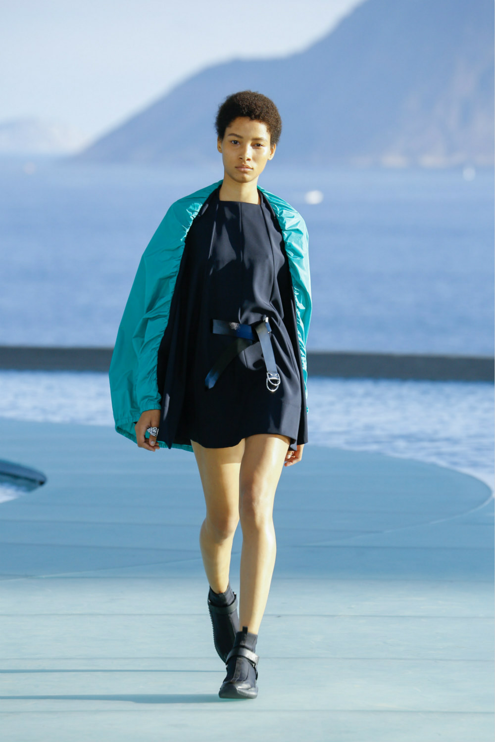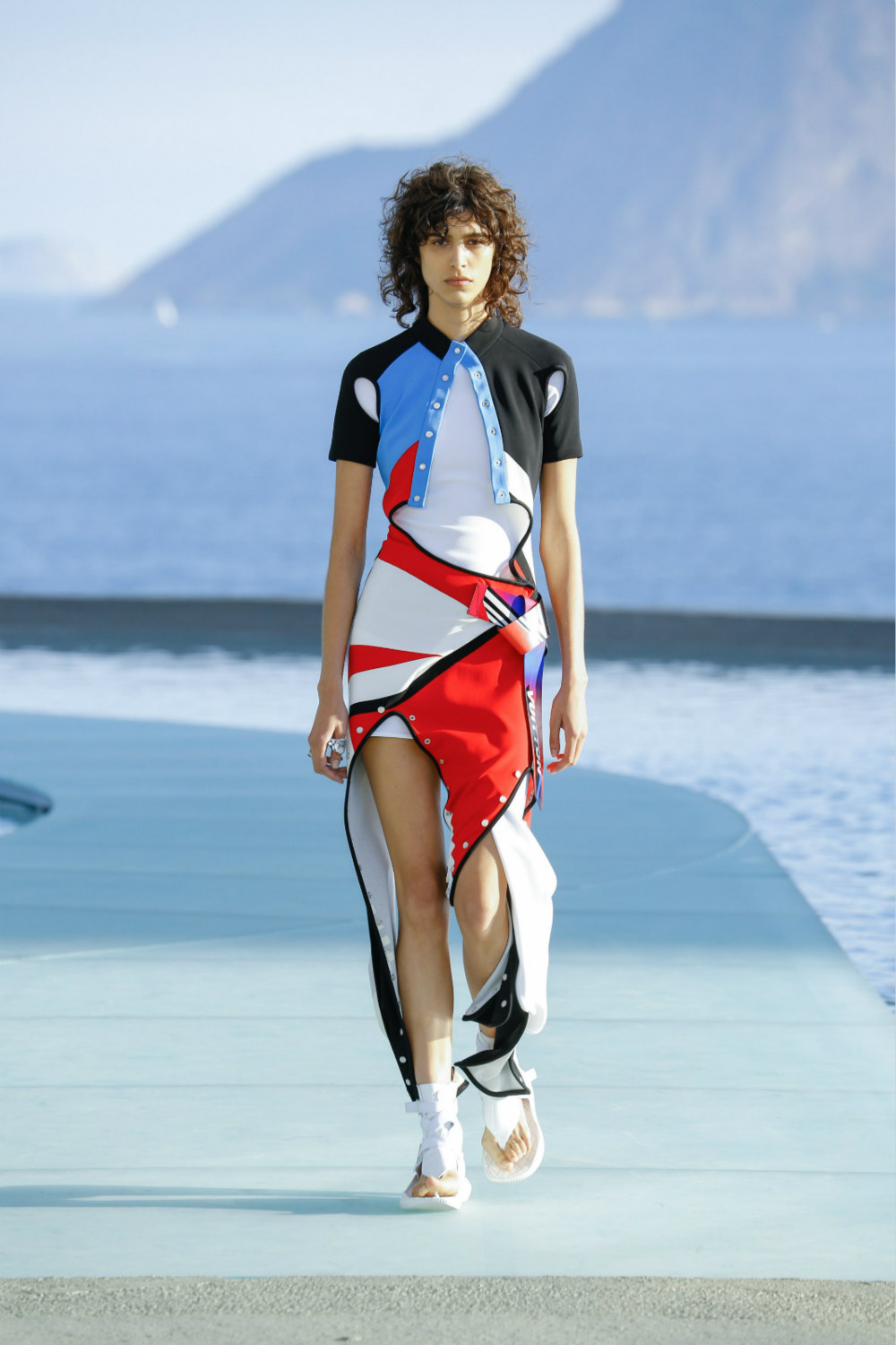 开场模特Mica Arganaraz就是自“跑道”走上T台,背景则是瓜纳巴拉湾。她身上纯粹、明了的蓝白红黑为整个早春系列定下基调。“我在里约感受到由现代与热带风情碰撞而出的爆发力,”创意总监解释说,全场47套造型任由运动、几何恣意展现。