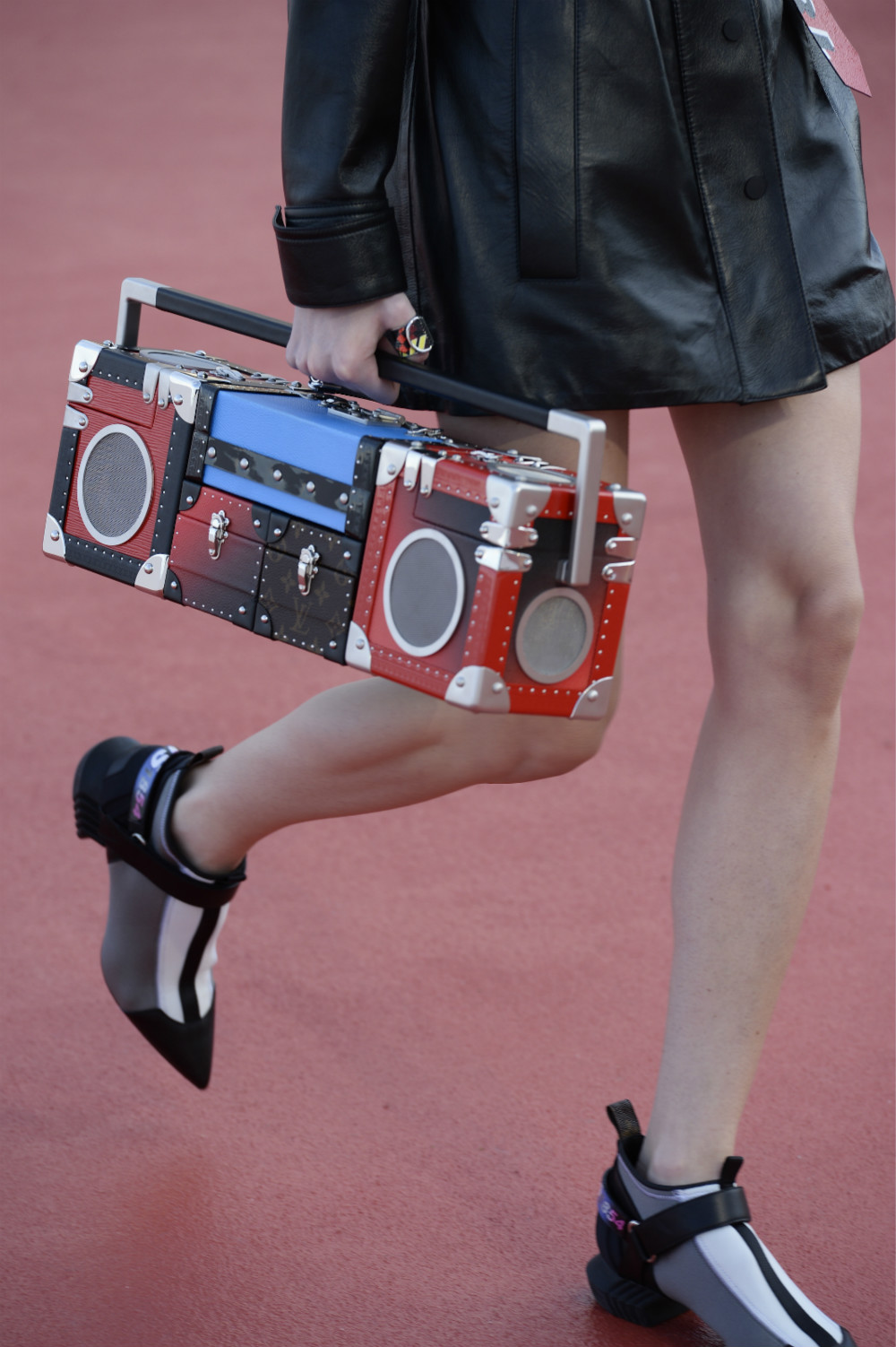和往常一样,大家落在配饰上的注意力毫不亚于衣服。例如“老式收音机”手袋——“变异”后的旅行箱一亮相就引来不少镜头一路追随;另一款撞色保龄球手袋则是赛车风,其侧面被处理成黄色的棋格纹。此外,LV在经典的皮质翻盖包与logo搭扣包上添加一些小花样,例如流苏或押花。