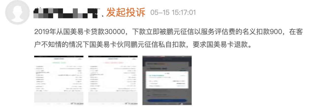 在此之前,根据央行罚单,鹏元征信应涉及到个人征信服务。有多条投诉信息显示,在2019年在国美易卡、弹元宝等申请贷款后,被鹏元征信收取数百元服务评估费。
