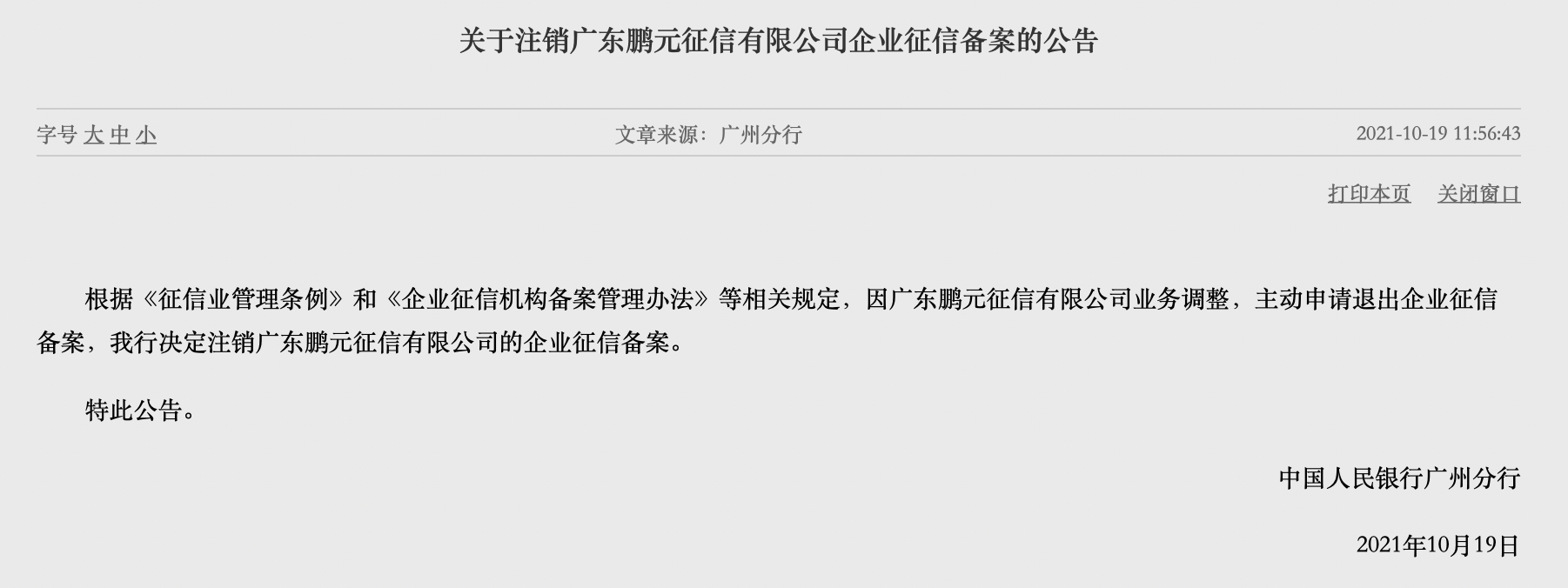 19日,中国人民银行广州分行发布公告,注销广东鹏元征信有限公司(下称 “广东鹏元”)企业征信备案。据公告,因广东鹏元征信业务调整,主动申请退出企业征信备案,该行决定注销广东鹏元企业征信备案。