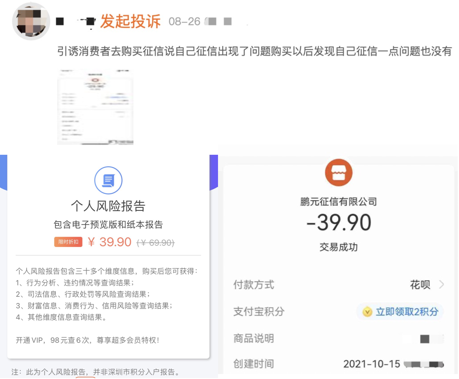 在黑猫投诉平台,有投诉者称,在鹏元征信查询个人报告,部分截图显示订单创建时间为10月,商品为个人报告,投诉者称并未出征信报告。部分投诉者表示,该服务未显示其信用卡逾期等已知问题。此外,也有投诉信息称,被引导购买征信,发现没有征信问题。