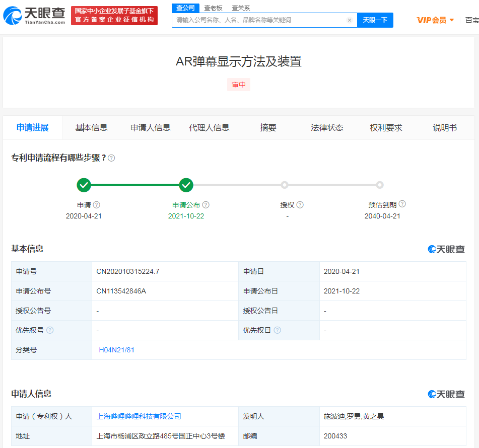 据天眼查APP显示,10月22日,B站关联公司上海哔哩哔哩科技有限公司公开“AR弹幕显示方法及装置”专利,公开号CN113542846A。