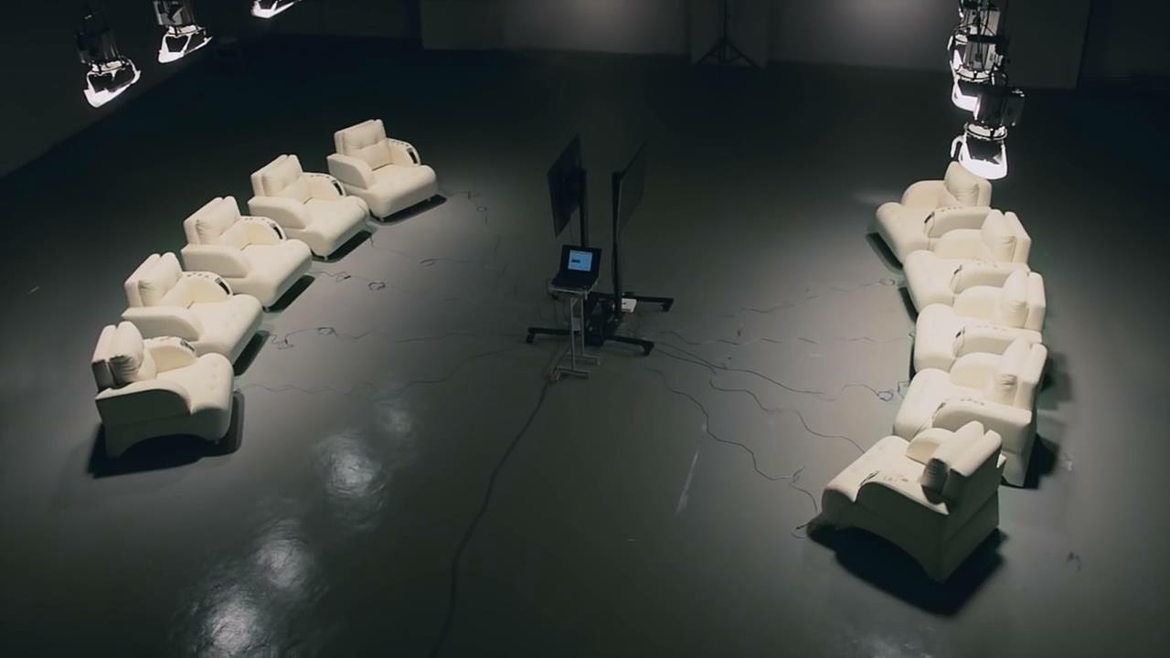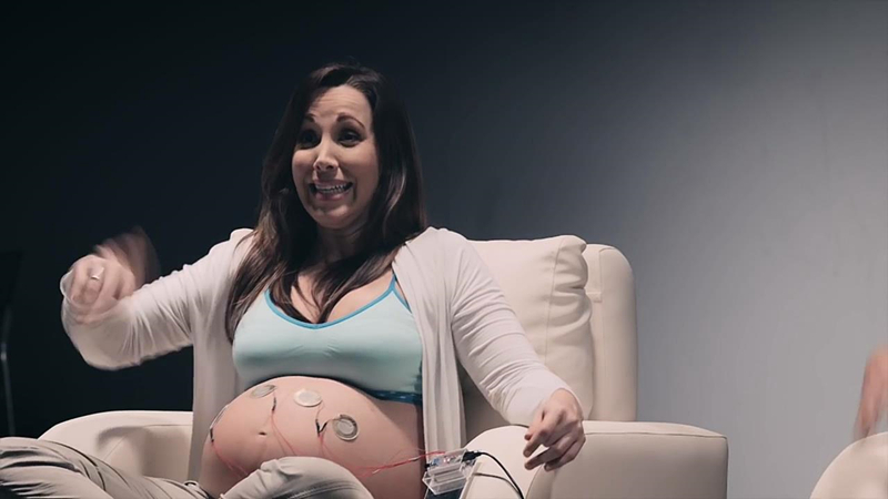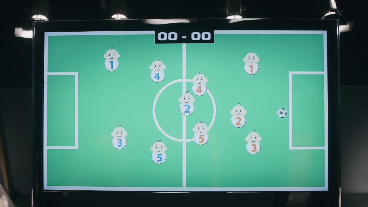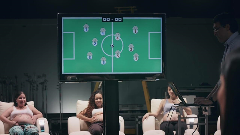 10位还未出生的宝宝变身成虚拟比赛中的足球队员,他们被分为蓝红两队。宝宝每动一次,感应器就会把动作转化成电子信号,而对应的球员就获得一次踢球的机会。如果信号较弱,队员可能只是传球给队友,如果宝宝动作强,对应的游戏角色就能大力抽射、或者远距离传球。