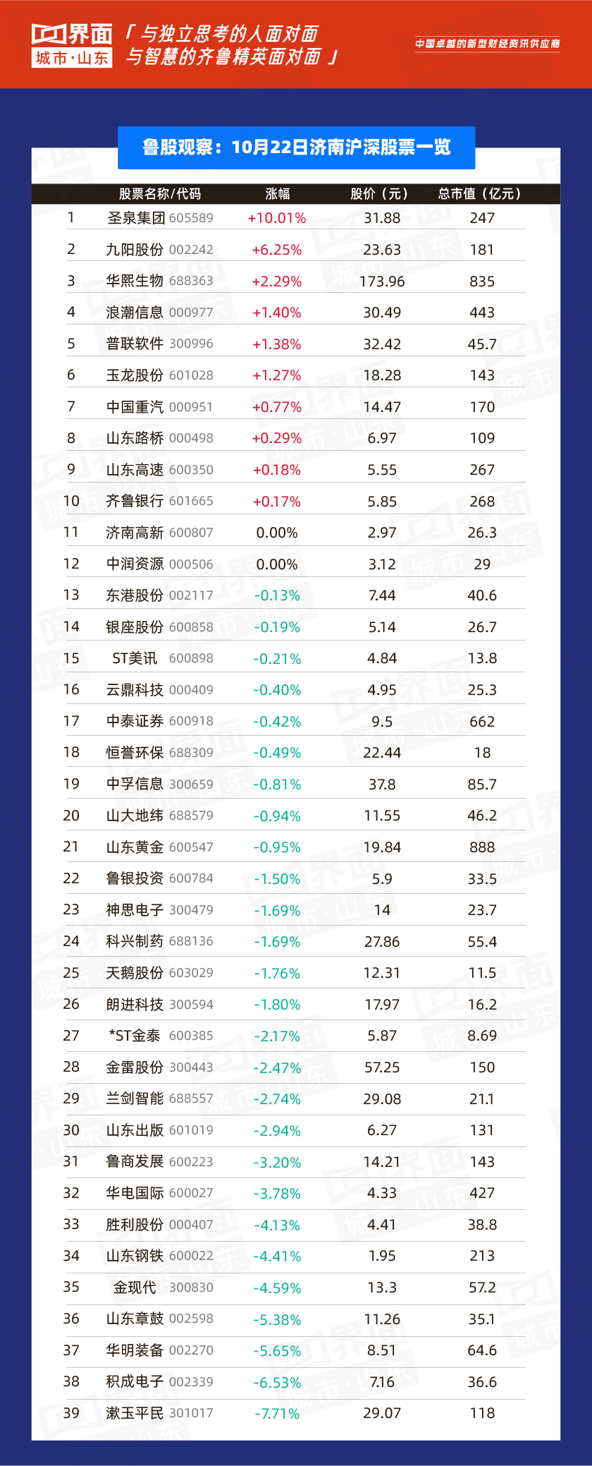 济南市涨幅榜首:圣泉集团(605589),涨幅10.01%,股价31.88元,总市值247亿元;