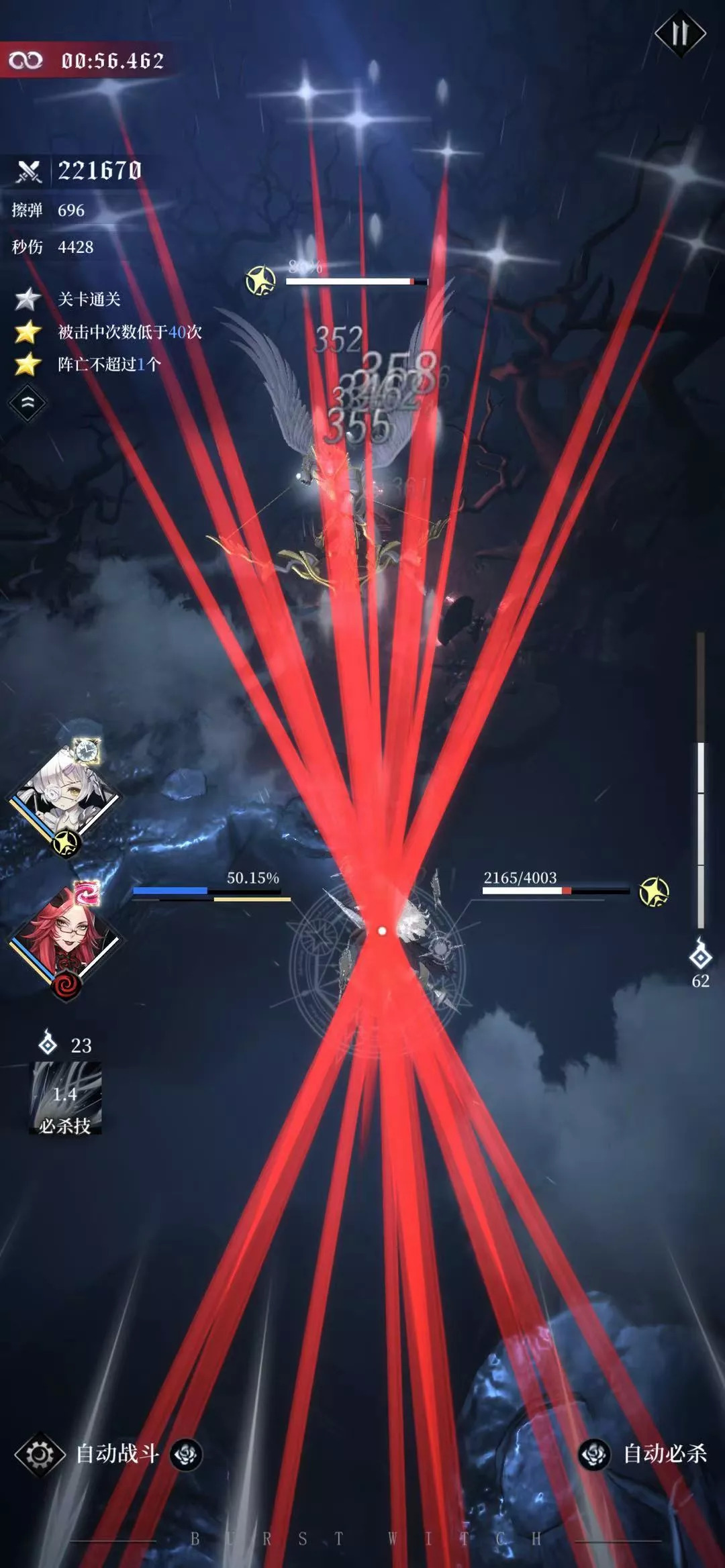 然而在《爆裂魔女》中,却改掉了“一触即死”这个曾经四五十年都极少出现变动的STG游戏铁则,取而代之的是血量值。这种变化虽然提高了玩家的存活几率,但是也削弱了游戏的刺激性。不仅如此,当游戏进行到第六关时,还出现了托管选项,但这个自动却不智能的托管制度也令不少玩家感到血压升高,因为托管下的角色基本抛弃了“躲避”这个要点,直接靠脸接伤害,最后凭借角色的高数值输出赢得最终胜利。
