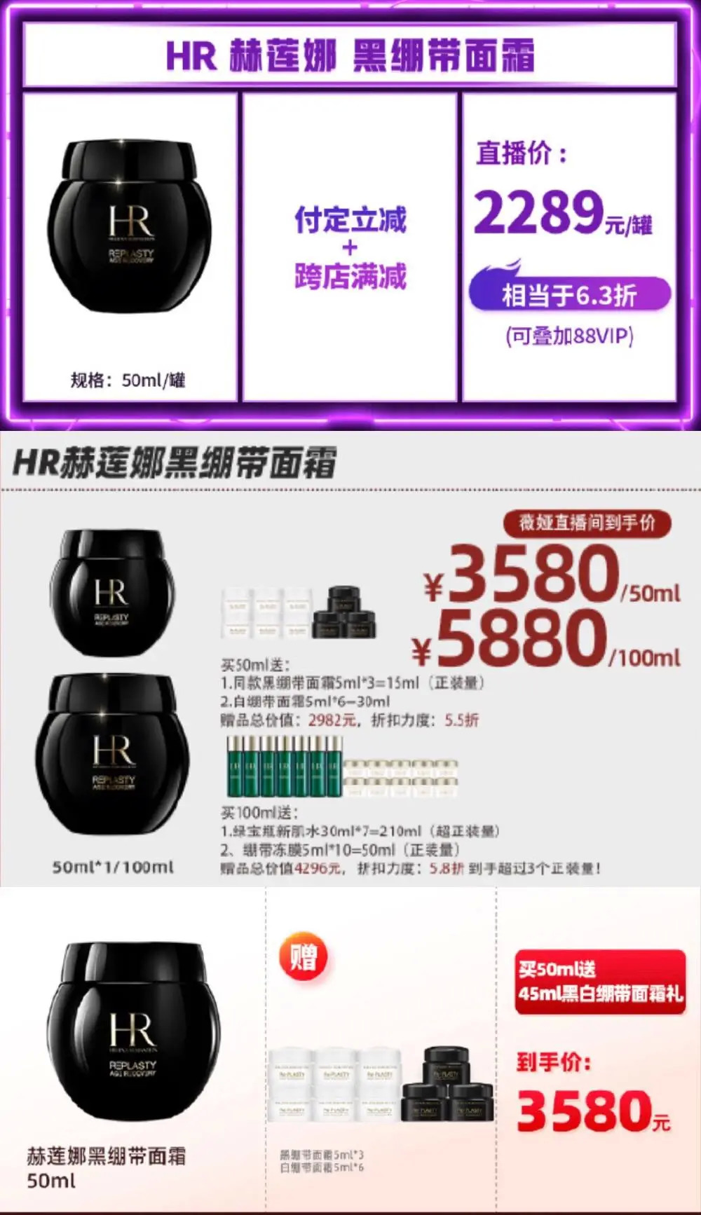 据开菠萝财经观察,雪梨虽然在产品折扣上比不过薇娅和李佳琦,但单品价格确实是最低的。比如,一罐50ml的HR赫莲娜黑绷带面霜,薇娅和李佳琦的价格都是3580元,并赠送总价值2982元的同款小样15ml和其他小样30ml,相当于5.5折;而同款商品雪梨的价格是2289元无赠品,相当于6.3折。