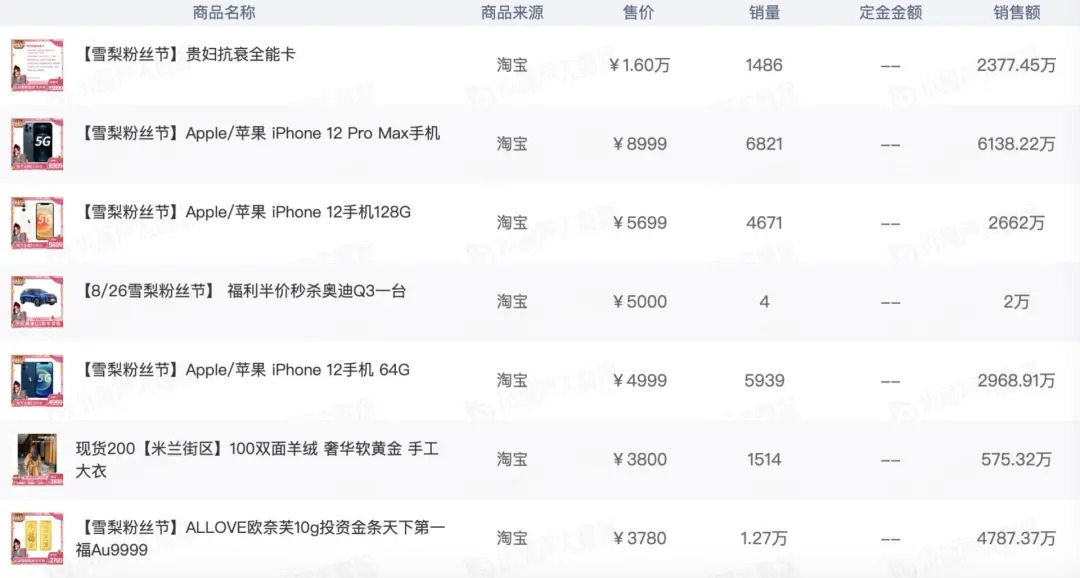 医美、手机、黄金,贡献了雪梨粉丝节直播的主要GMV 来源 / 小葫芦大数据