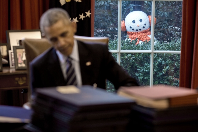 2016年12月16日,白宫工作人员在总统办公室外的玫瑰花园点缀雪人,欢迎奥巴马上班。