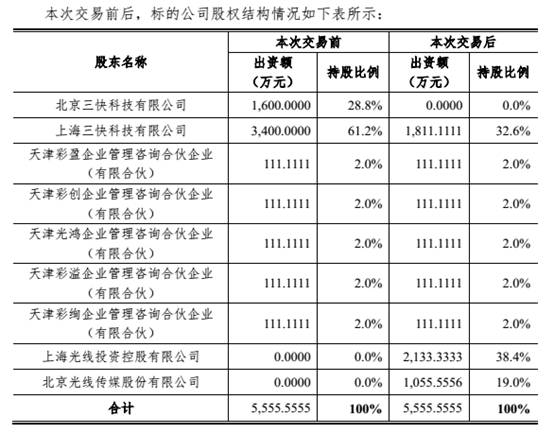 公告显示:光线控股拟以其持有的1.76亿股光线传媒股份为对价,换取三快科技持有的标的公司28.80%的股权;光线控股拟向上海三快支付人民币8亿元现金对价,购买其持有的标的公司9.60%的股权;光线传媒拟向上海三快支付人民币15.83亿元现金对价,购买其持有的标的公司19.00%的股权。本次交易完成后,光线控股持有标的公司38.40%股权,光线传媒持有标的公司19.00%股权,上海三快持有标的公司32.6%股权。