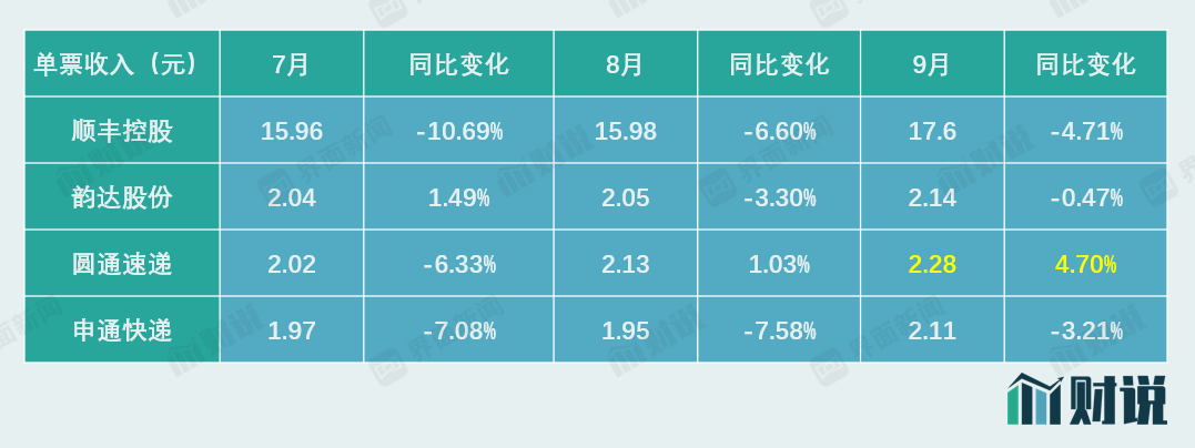 更重要的是,行业价格战似乎已经接近尾声。受益于3月以来的政策升级和9月开始的派费涨价,快递行业价格战缓和,快递公司间的单票收入也逐渐回归正常。根据国家邮政局的统计数据,今年9月,全国快递服务企业业务量完成94.5亿件,同比增长16.8%;业务收入完成921.4亿元,同比增长11.8%。前9个月,全国快递服务企业业务量累计完成767.7亿件,同比增长36.7%,整个9月份的快递行业量件增速显著放缓。