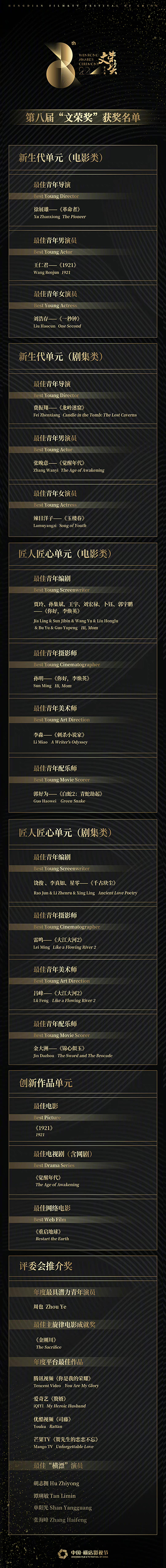 10月23日,第八届文荣奖颁奖典礼在横店影视城举办,《1921》获得最佳电影奖,《觉醒年代》获得最佳电视剧(含网剧)奖,《重启地球》获得最佳网络电影奖。王仁君、刘浩存分别获得“新生代单元“(电影类)最佳青年男演员奖和最佳青年女演员奖;张晚意和辣目洋子分别凭借《觉醒年代》和《玉楼春》获得“新生代单元”(剧集类)最佳青年男演员奖和最佳青年女演员奖。