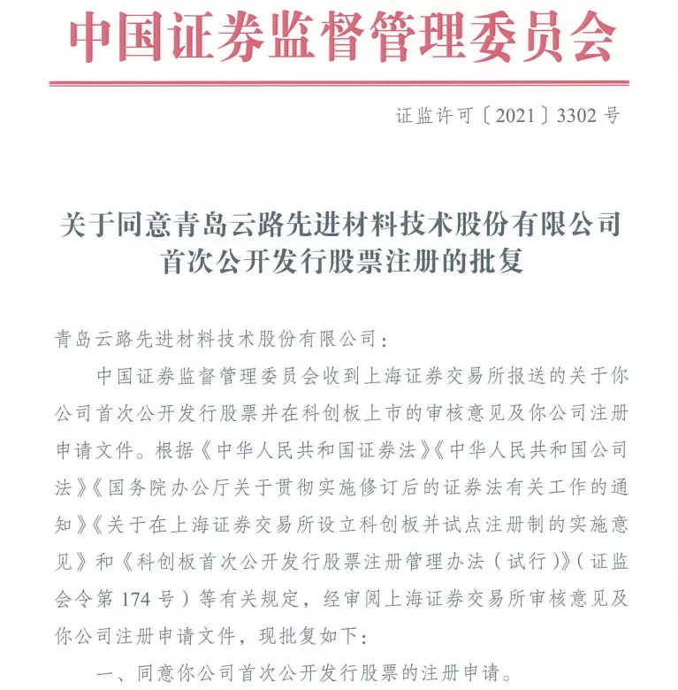 10月19日,上交所网站中的青岛云路科创板股票审核状态正式由“提交注册”变更为“注册生效”。次日,中国证监会发布批复文件,正式宣布同意青岛云路科创板首次公开发行股票的注册申请。这意味着,继8月30日成功过会之后,青岛云路距离二次上市路的终点再进一步。