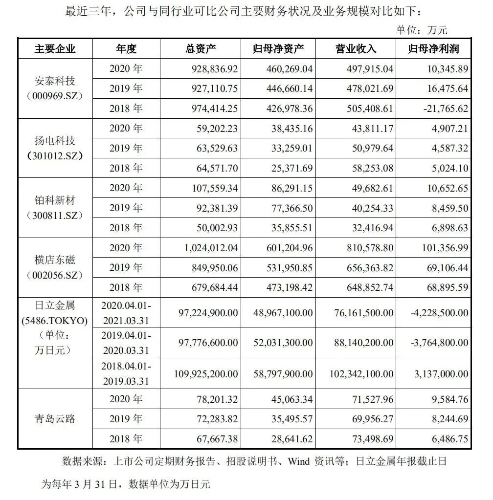 在国内,主要竞争对手之一的安泰科技同样具有央企背景,较早进入行业、上市平台等优势使安泰科技已形成较大业务规模。公司年报显示,2020年,安泰科技总资产、营业收入及归母净利润分别达92.88亿、49.79亿及1.03亿元,远高于同报告期内青岛云路的业绩。