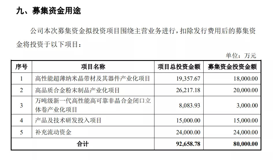 良好的市场前景,在青岛云路本次IPO募集资金的安排上有着充分体现。招股说明书(注册稿)显示,青岛云路此次IPO拟发行不超过3000万股,预计募集到的8亿元资金将全部用于主营业务发展,其中1.80亿元(占总募资的22.50%)投向高性能超薄纳米晶带材及其器件产业化项目。
