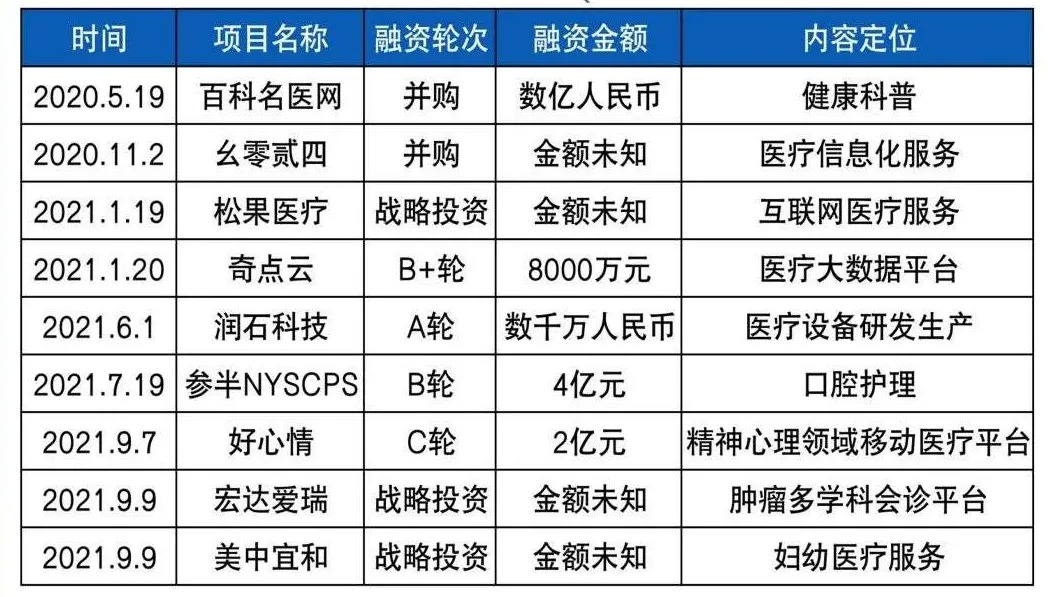 据“健康局”统计,从2020年5月到2021年9月,字节跳动在医疗领域的投资项目有9项,覆盖健康科普、各领域医疗服务、医疗大数据等多个方面。