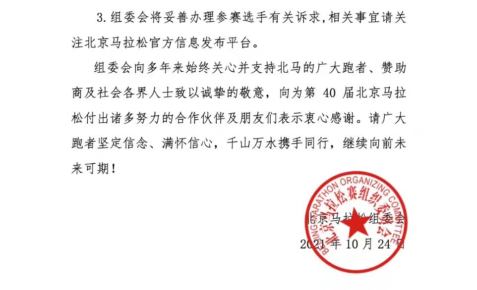 北京时间2021年10月24日,北京马拉松组织委员会宣布,2021贝壳北京马拉松赛事将延期举办。