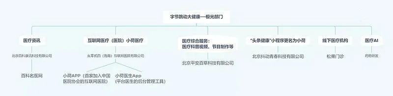 2020年5月,字节跳动收购了百科名医网,目前已成为字节跳动线上医疗信息检索、科普的流量入口,更名为 " 小荷医典 ";11月,成立大健康业务部门“极光”,由原百度副总裁吴海锋带队,统一品牌名称为“小荷健康”,随后推出名为“松果门诊”的线下诊疗机构(现已更名为“小荷门诊),同时并购了吴海峰创立的幺零贰四科技(海南)有限公司,其经营了一家综合性互联网医院;而在刚刚过去的9月,字节跳动又投资了三家大健康领域的企业,涉及心理、肿瘤、妇幼。
