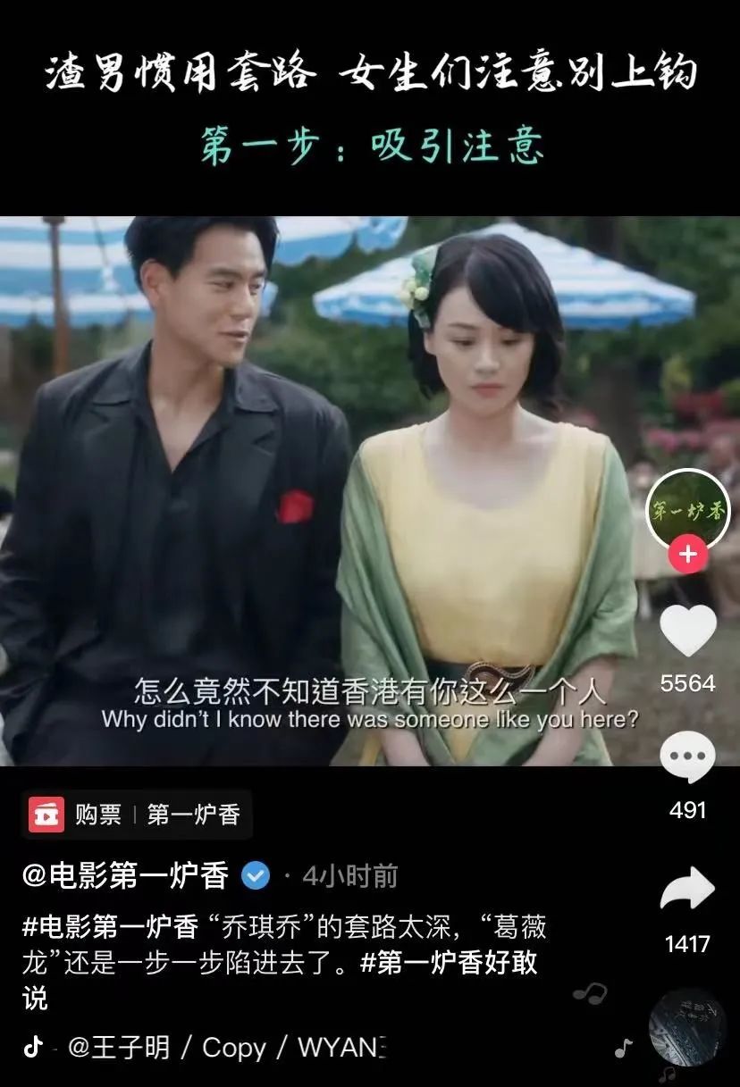 但包括短视频营销、海报物料发布等系列宣发动作上,《第一炉香》上却选择了与张爱玲背道而驰的“土味情话”“疼痛文学”,言必提“爱情”,使其观感近似于“青春伤痛文学”。