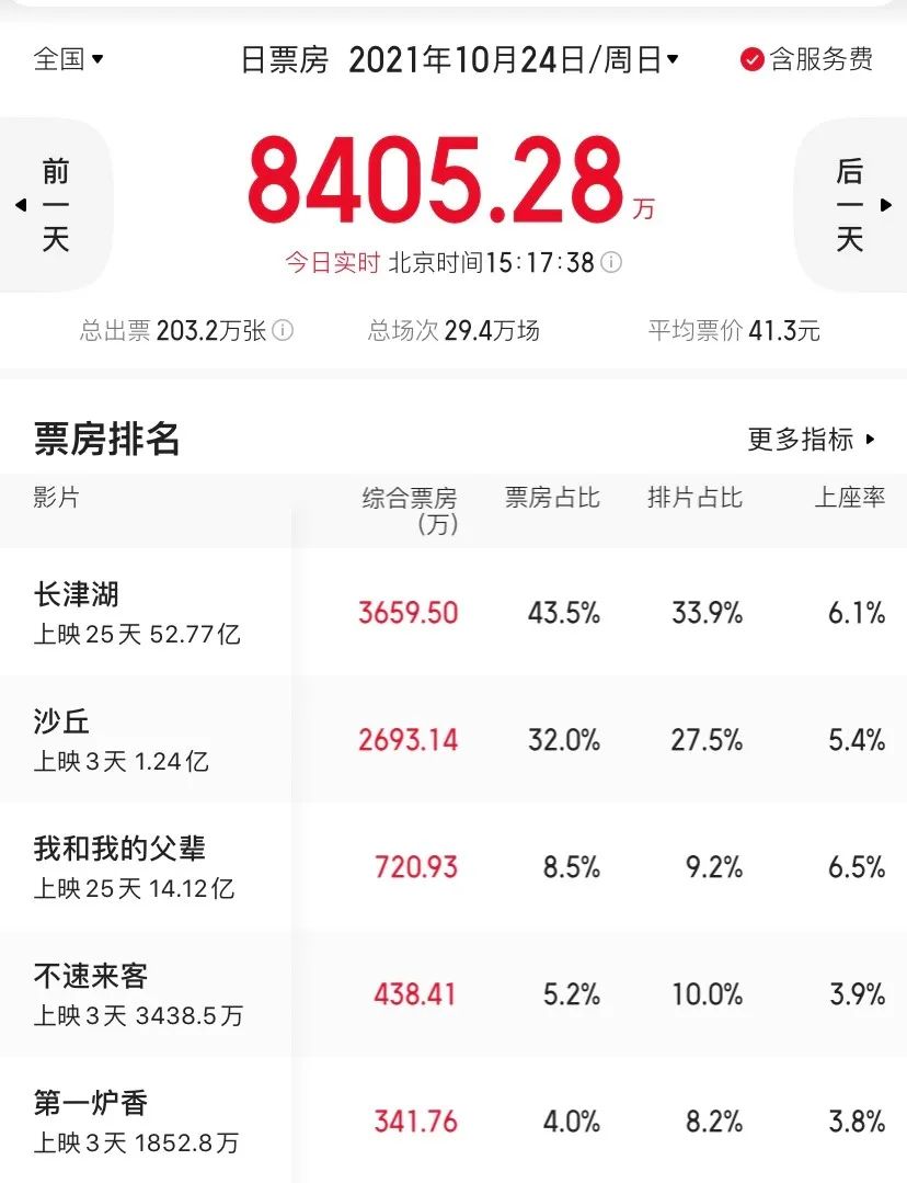 如此顶级班底,最终呈现出的美术,场景,服装等都颇具美感,然而豆瓣5.7分的评分,刷新了许鞍华个人职业生涯的最低分。本周末两部重点新片,文艺片《第一炉香》,和文艺内核的科幻大片《沙丘》均未能成功接棒,大盘依然由《长津湖》掌控。还有一周登场的《007:无暇赴死》,能够成功突围吗?