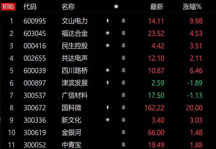 财联社消息,市场焦点股文山电力(5板)竞价涨停、福达合金(5板)高开4.53%,股权变更的民生控股(2板)高开3.51%、共达电声(3天2板)高开2.11%,与比亚迪合作的四川路桥(2板)高开6.46%,地产股津滨发展(2板)低开1.89%,芯片产业链的广信材料(创业板首板)低开1.13%、国科微(创业板首板)高开20.00%,网红经济概念新文化(创业板首板)高开3.03%,化工股金银河(创业板首板)高开1.48%,元宇宙概念股中青宝(创业板首板)高开1.88%。