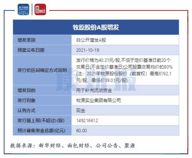 牧原股份近期披露定增预案,拟非公开发行股票数量不超过1.49亿股(含本数),合计发行额为不超过60亿元(含该数),全部由牧原集团以现金认购,锁定期为18个月,募集资金将全部用于补充流动资金。