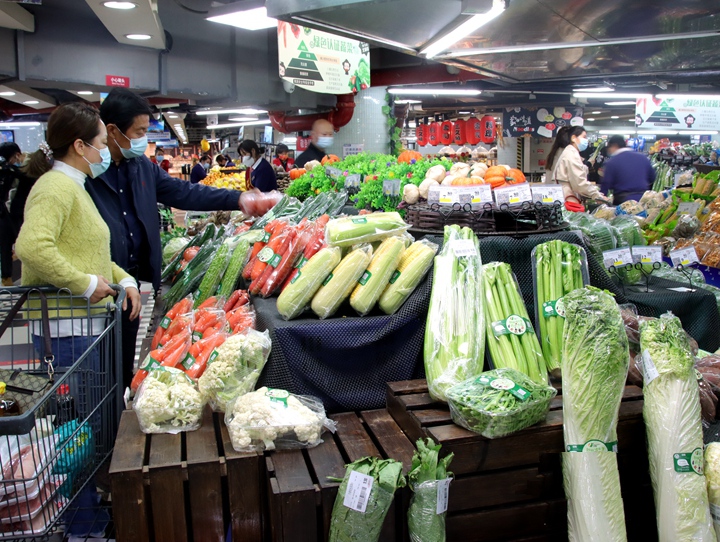 记者在石家庄市北国超市西兴店看到,货架上的蔬菜水果摆放整齐,标签上醒目的标着菜价,消费者正在有序的选购着。