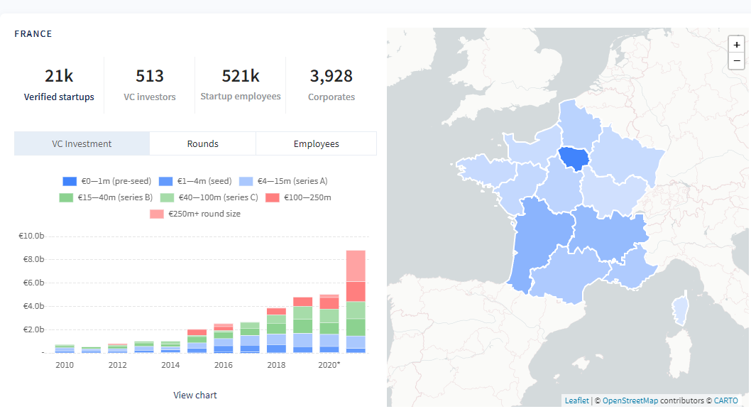 根据法国科创官网披露,法国已有超过2万1千家已认证初创企业,513家VC资本,涉及52万多个工作岗位。