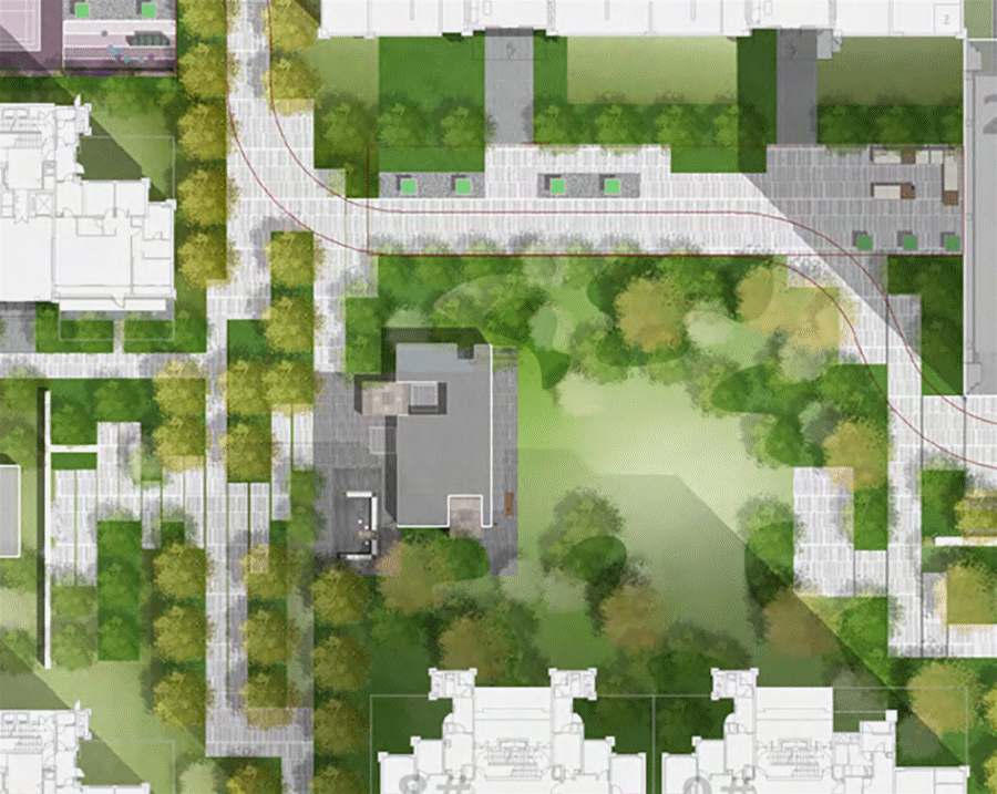 茶亭,如绿地里的明珠,选址考究便捷与和谐。与绿地互为镶嵌的整体联系,谱写内向的舒缓。退出归家道路一定距离,降低行人的干扰。借助游园小径,方便住户轻松便利抵达。