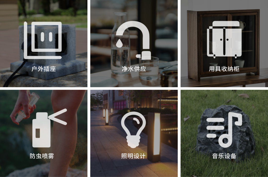 隐蔽式户外电源、净水供应设施、清洗设施、用具收纳柜等,