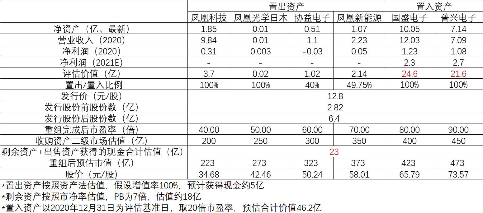 按照以上估值假设,重组后,凤凰光学的市值在223-473亿元,对应股价在34.68-73.57元/股。